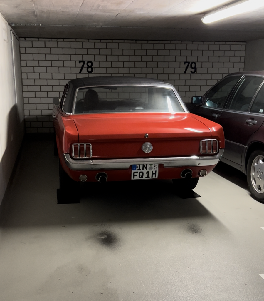 Ende Oktober fahre ich ihn in unsere warme, trockene Tiefgarage. Unter die Reifen lege ich gerundete Reifenmatten, damit sie keine Standplatten bekommen. Unter das Auto lege ich außerdem ein flaches Blech mit Kanten – der Mustang verliert ein wenig Getriebeöl. Nicht viel, aber warum sollte man den Boden unnötig dreckig machen? Wie ich immer sage: Jeder alte Ami tropft ein bisschen. Tut er es nicht, stimmt irgendwas nicht.